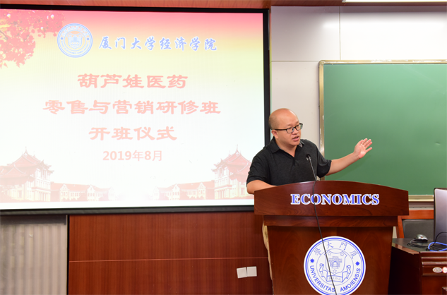在开班仪式上,廖景峰主任首先代表厦门大学经济学院热烈欢迎乐发医药零售与营销研修班的学员到厦大学习,并就厦门大学及经济学院的相关情况进行了介绍。他说,乐发学员走进厦大就是厦大的校友,希望未来的日子能够关心、支持母校的发展,多提宝贵意见,同时他也祝大家在厦大学习期间学有所成、学有所获。
